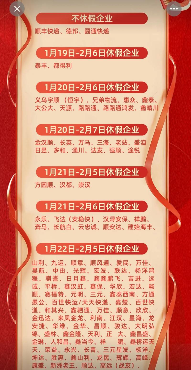 苍南申通快递几号放假? 我可以为您提供一个详细的说明和查询方法,帮助您获得最准确的信息,主要放假时间节点(参考往年规律)通常情况下,快递行业的放假高峰期主要集中在以下几个时间:春节(最重要的假期)放假时间:通常从除夕前2-3天开始,一直持续到正月初六或初七,具体情况:这是全年最长的假期,也是快递业务最繁忙的时期,放假时间相...